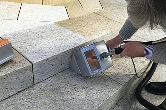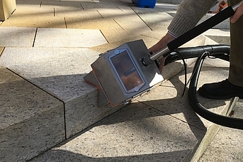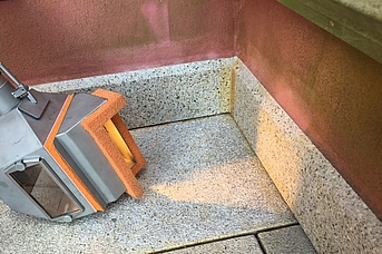 Düz yüzeyde, jet davlumbazı kolayca emilir ve üzerinde patlatma işleminin başlatıldığı bir vakum yaratır. Granit plakalar arasındaki bağlantılar karışmaz. Granit merdivenlerin işlenmesi için ilgili amaçlara ihtiyaç duyulmuştur. Bunlar basitçe jet davlumbaz üzerine yerleştirilir ve kolayca çıkarılır. Standart aksesuar olarak bir dış köşe, bir iç köşe ve bir köşe köşesi vardır (3 boyutlu köşeler için). Bu tam olarak terastaki yan panellerin işlenme şeklidir. Systeco'nun temizleme makinesi burada çok iyi ve kalıcı başarılar elde ediyor.
