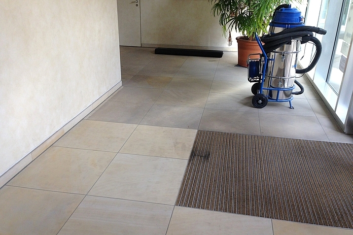 Kumtaşı zemin kamu trafiği ile çalışma sırasında temiz, bu mümkün mü? Bu zorluğun çözümü kolay değildir. Geriye kalan tek şey, kapalı devre ile systeco'dan vakumla püskürtme işlemidir. Kumtaşı döşemesinin yarısı, alanı tıkamadan Tornad ACS temizleme makinesi ile temizlendi ve mühürlendi.