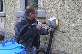 Bekçiyi, Berlin'deki bir konut derneğinde kaba bir duvarda eğitin. Kısa bir brifingin ardından, herkes kullanımı kolay temizlik cihazını kullanabilir. Grafiti Tornado ACS temizleme makinesi ile tüm yüzeyden kaldırılmıştır, vakumlu patlatma işleminin kapalı çevrimi iş güvenliği önlemleri gerektirmez.