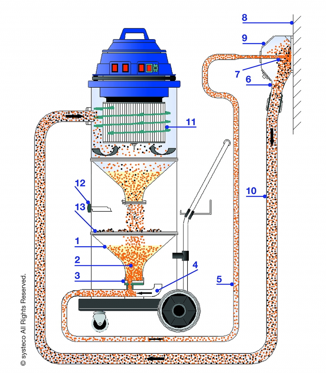 Systeco'nun yenilikçi temizleme teknolojisi kapalı bir döngüde çalışır. Çevrede erozyon artıkları yoktur. İnce toz filtresi tüm maddeleri emer, daha kaba bileşenler makinede bulunan bir ekranda toplanır. Böylece, tüm kalıntılar işlemden sonra rahat ve çevre dostu bir şekilde bertaraf edilebilir.