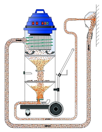 Bu, negatif basınç ve püskürtme ortamıyla (granüller), katları yüzeyden katmana tamamen kirleten yenilikçi vakumlu püskürtme işlemiyle mümkün olmaktadır. Elde edilen Abtragungsrückstände, makinenin filtre sisteminde toplanır ve temizleme işlemi ortamının tamamlanmasından sonra gerginlik giderme sağlanabilir.